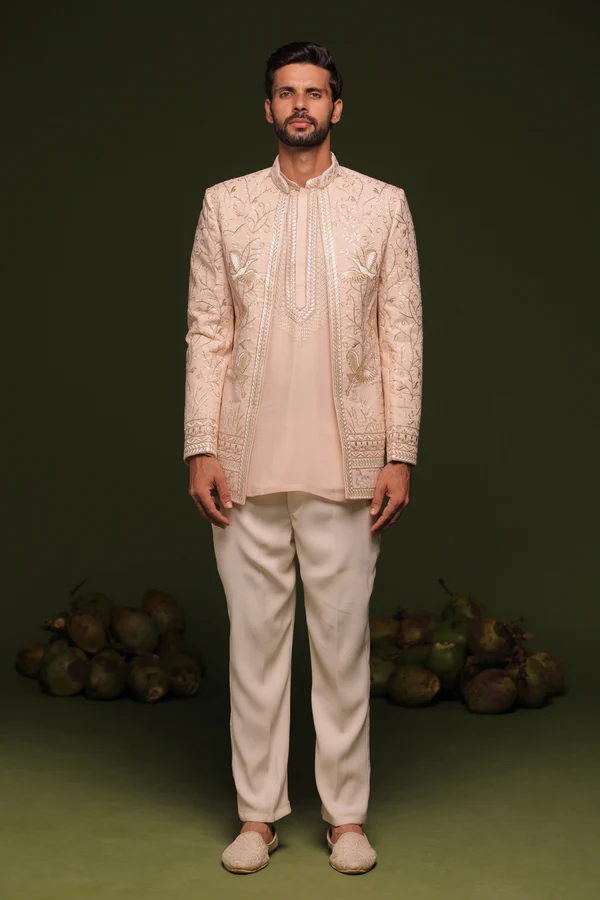 An elegant Jodhpuri set featuring Cut Dana handwork and Resham embroidery. The collar boasts exquisite handwork, while the short yoke design kurta is enhanced with Resham and sequinned detailing.